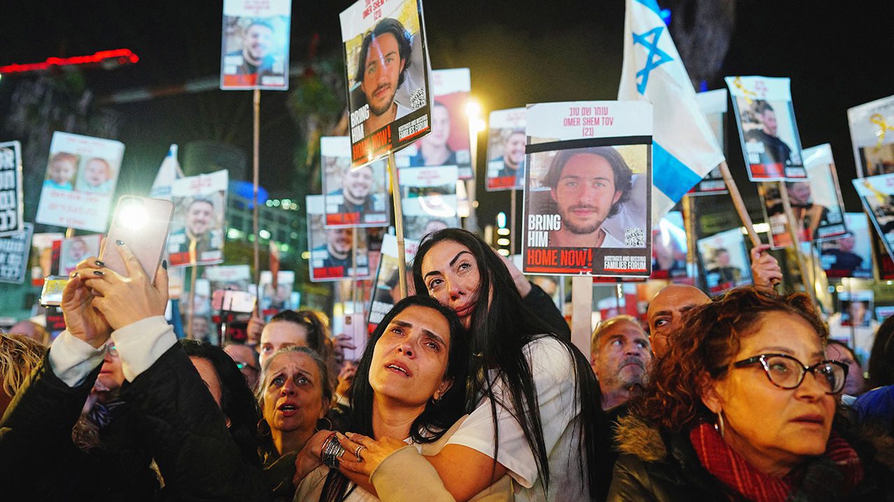 Outside Prime Minister Benjamin Netanyahu’s home in Jerusalem, around 300 people led by families of hostages holding up photos of their loved ones, observed a minute of silence for the dead as a siren sounded.