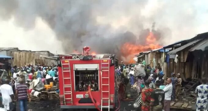 “On arrival at the scene, it was discovered that make-shift commercial shops of various sizes and patterns used in trading and stocking of woods were well alight as the crews deployed copious water and chemical foam compound to douse the raging fire,” the statement reads.